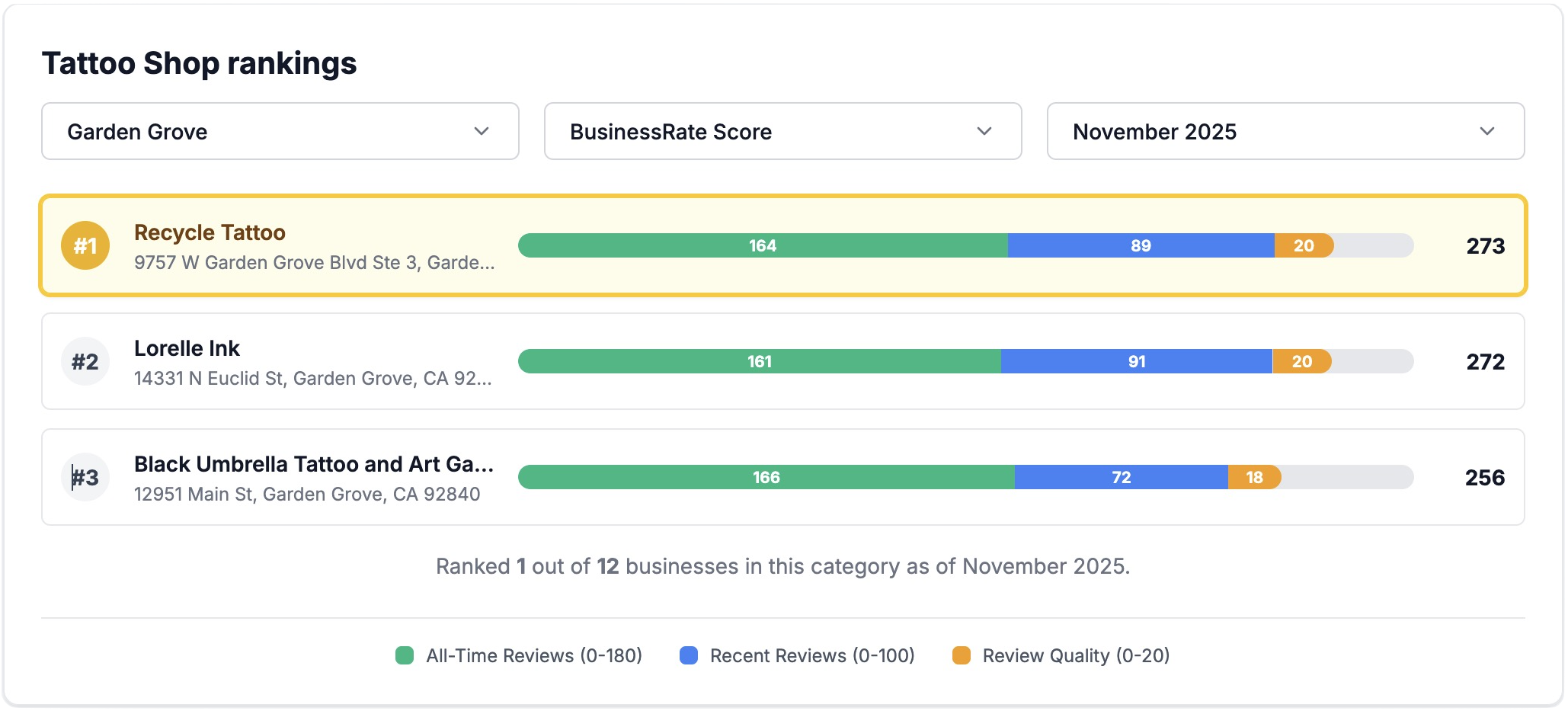 According to BusinessRate’s monthly rankings, yes. Recycle Tattoo is currently ranked #1 in Garden Grove and #1 in Westminster, based on review performance, consistency, and quality.